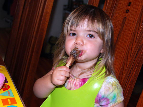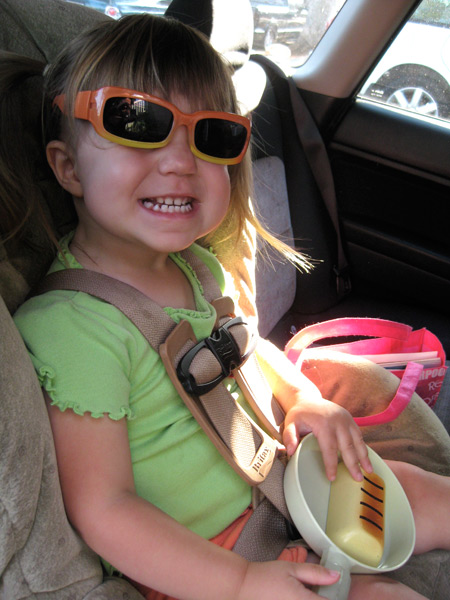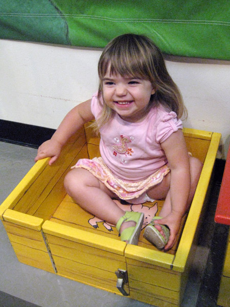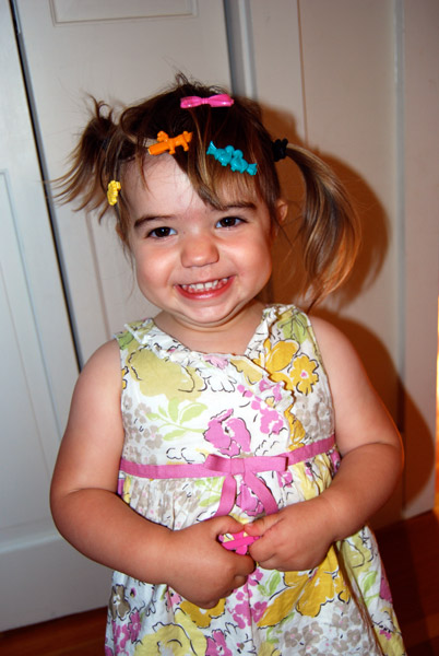 For the past two months, she’s been asking to use the potty at home and about town at least three times a day. Until recently she refused to use the pint-sized potty at school (ironic – it’s just her size!) but was inspired when some fellow two-year-olds took to it. She now wears her beloved Elmo panties to school and last week came home dry four out of five days. Not quite sure what led to multiple “uh ohs” on Thursday. She’s also been doing pretty well at home and around town, though is most definitely still “in training.” I’m thrilled and slightly surprised. Kai was 3 1/4 by the time he made it this far, not 2 1/4. Yay Jelly Bean!
