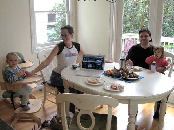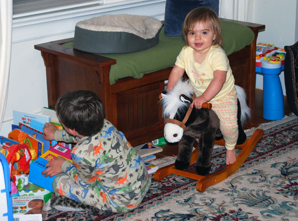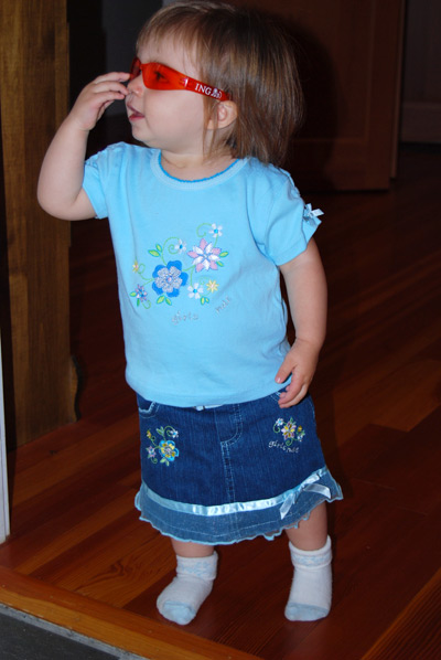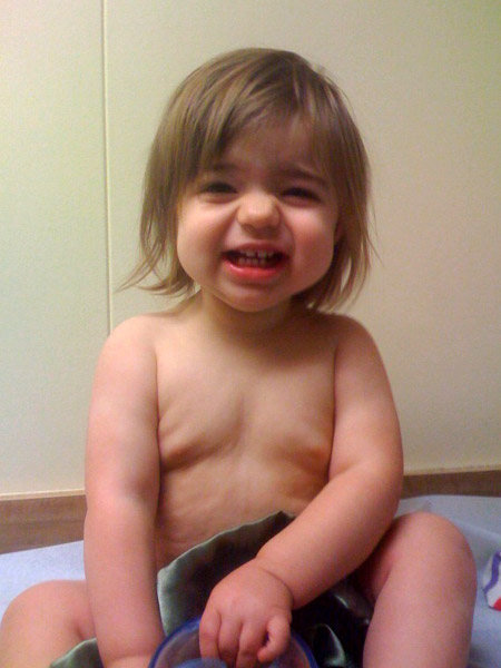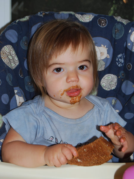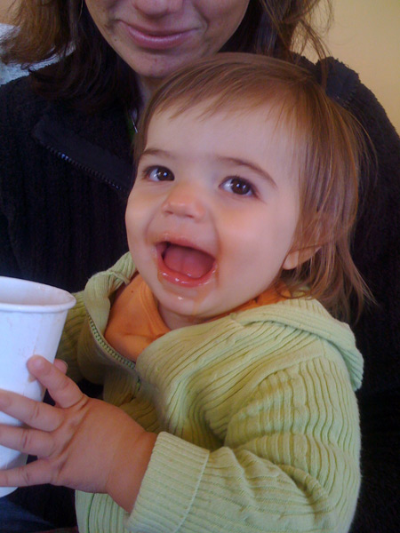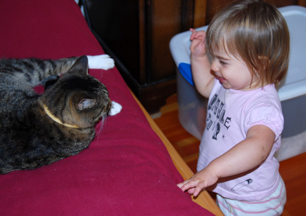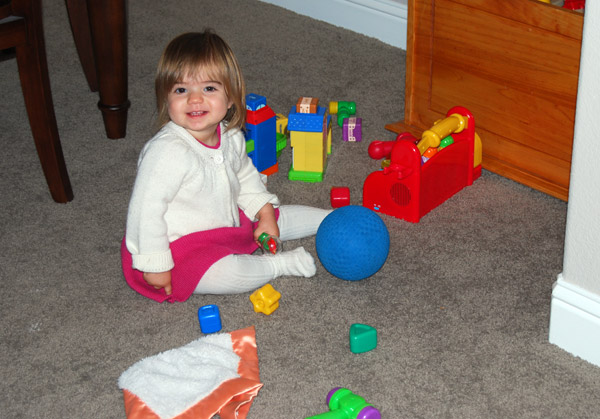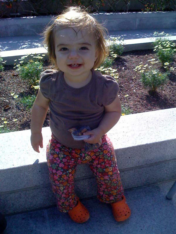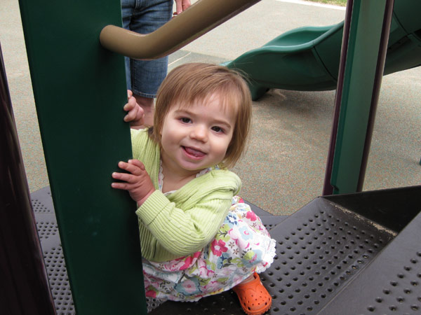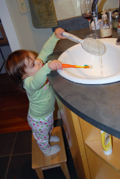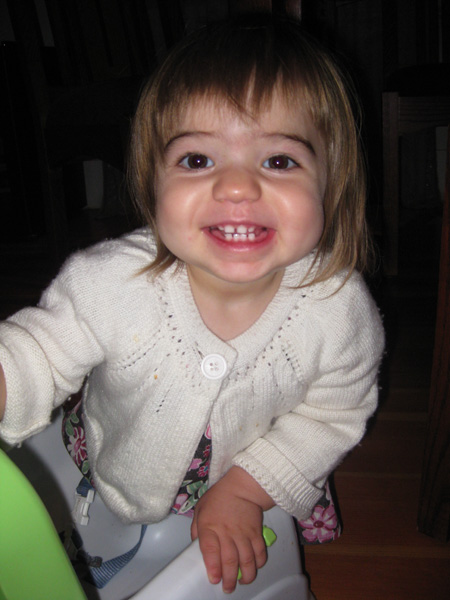 She’s talking up a storm (mostly single words, and she now spontaneously says “PEEzh” when she wants something), opens inside doors all by herself (good for us since she loves to close them), and has thrown a single full-blown tantrum (when we cut off her teeth-brushing after 10 minutes of what was really water play).