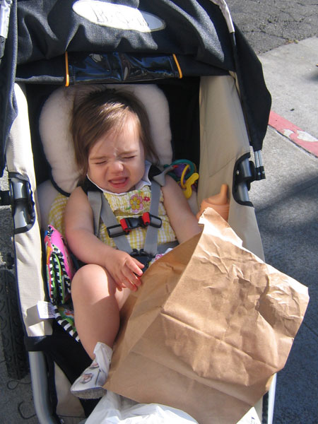 Finally, a few days ago she turned into Linus, deciding it would be really cool to take her little blankey everywhere. On a recent trip to SF we got to the elevator in the parking garage when I realized it was missing. We found it next to a small puddle of oil by our car but she begged me to let her have it. You can see in the photos above that I gave in – she’s walking along the fountain at Yerba Buena Gardens with it tightly in hand.