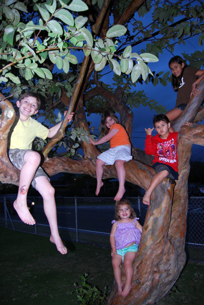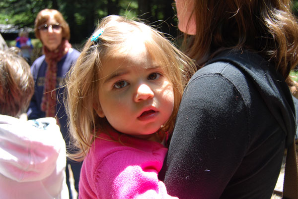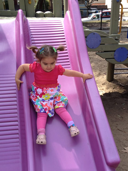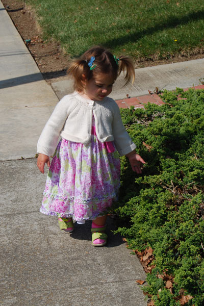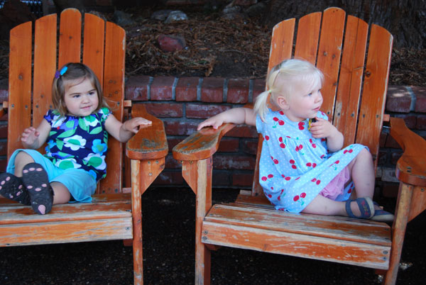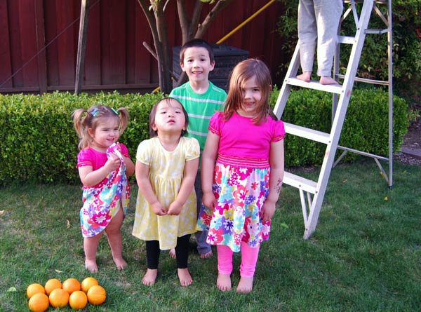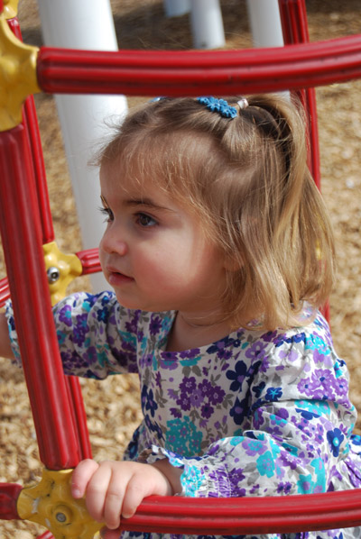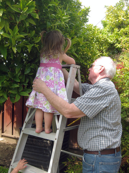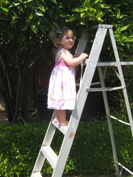 Her desire to observe and methodically emulate comes in handy for getting what she wants. At the park the other week, a friend and I were hanging out with Nalani in the fenced-off toddler section while the bigger kids moved back and forth between playgrounds. One moment Nalani was climbing peacefully behind a slide-locked gate, and the next she was out. From watching the big kids open and close the “lock,” she figured out how to do it on her own. Then, hanging out with her cousins at my parents’ house last weekend, Nalani patiently watched the older kids climb Grandpa’s ladder to pick oranges. You could almost see her taking notes in her nearly two-year-old head. I knew by the end of the weekend she’d walk up to the ladder without a word and climb to the top. About an hour before we left, she did.