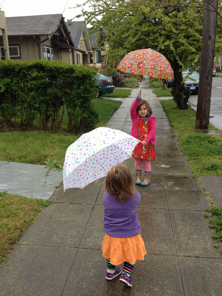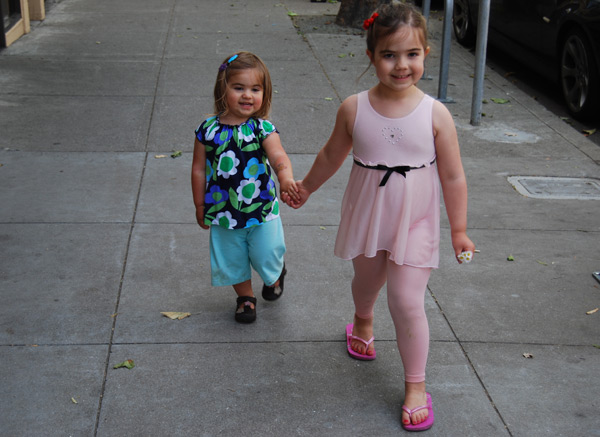 Even Nalani’s destructive streak comes with intent. It seems tied to her love of having an audience, or more to the point, getting a reaction. We repeatedly observe her walk into a room and assess the surroundings with a little glint in her eye that says “Ok, what can I do here to make my presence known?” Then she’ll go to it. Sometimes it’s swiping an entire shelf of clothes to the floor at Old Navy, or dumping out a box full of dot paint when I pick up Melina at preschool, or tossing pantry items one by one out of our corner kitchen cabinet. Another tactic for grabbing an audience is to run away: at the park, at Melina’s school as I’m trying to coral both girls out the door, or at home when we’re trying to put on her jammies. She always makes a point of stopping to look back, just to make sure we’re watching her grand escape. And she always looks very proud.